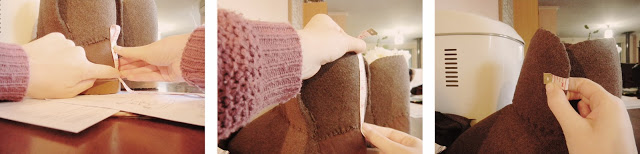 As for the material – you’ll need two shades of brown in two different material types. I used some faux leather I had left over from an old project and a big sweater I found online that had the weave I was looking for. When you go shopping for your material, bring a reference picture of the actual boots to help you find the right texture and colour.