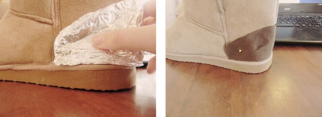First, you’ll need to make a pattern with the tin foil. Wrap it around the heel of your boot, folding and scrunching the tin foil until you’re satisfied with the shape. Now unfold it and there’s your pattern piece. Use this to cut out two pieces of your lighter brown fabric and pin the pieces to the heels of your boots, and then sew them on.