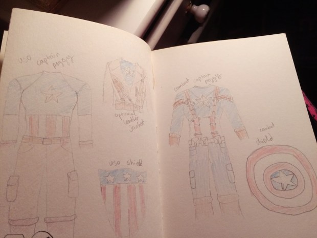 The final design is mostly inspired by Steve’s outfit when he rescues Bucky and his regiment in The First Avenger. This was half because I liked the grittiness and reality of it and half because I didn’t actually have enough time to make a matching pair of blue trousers.