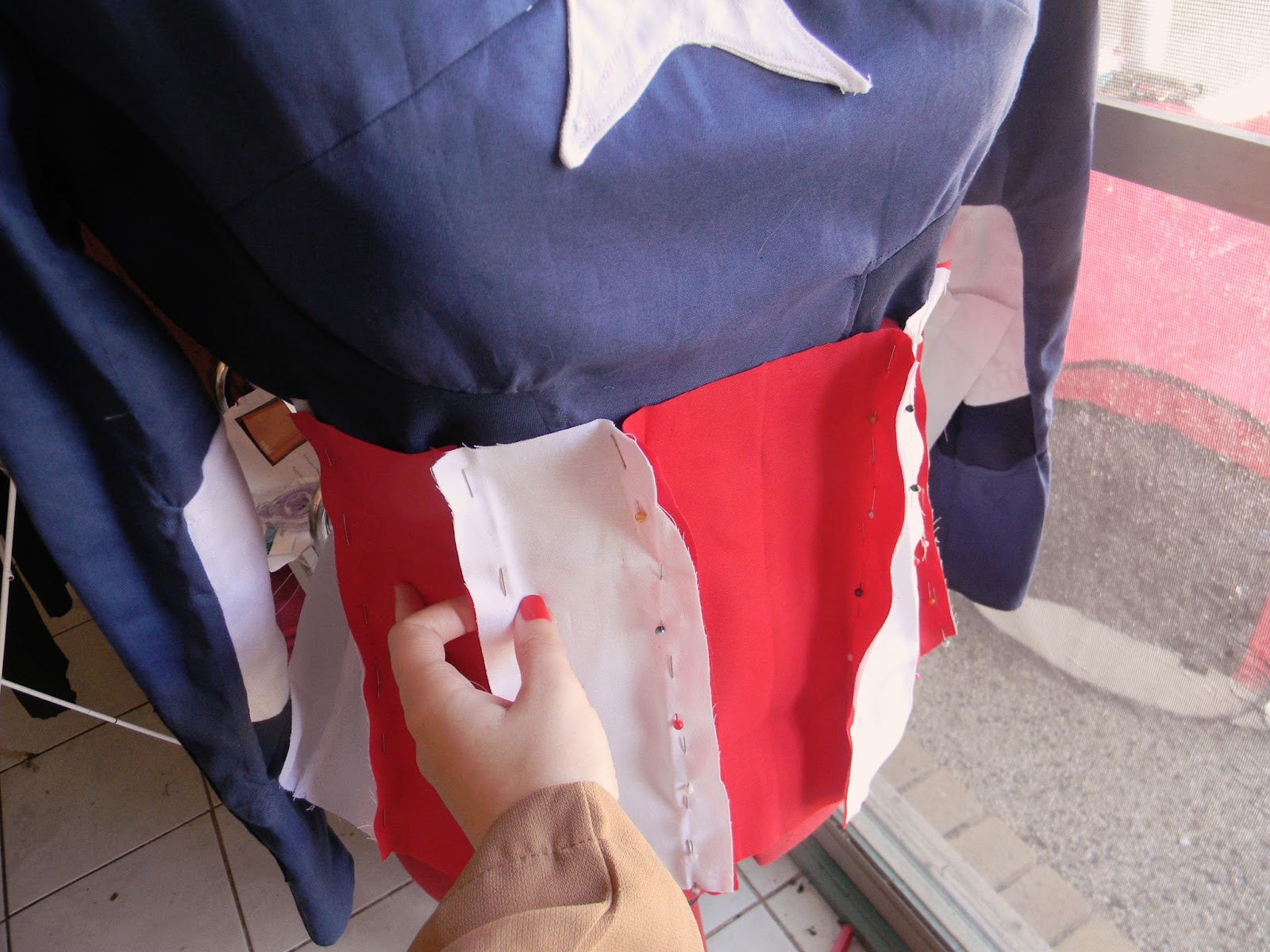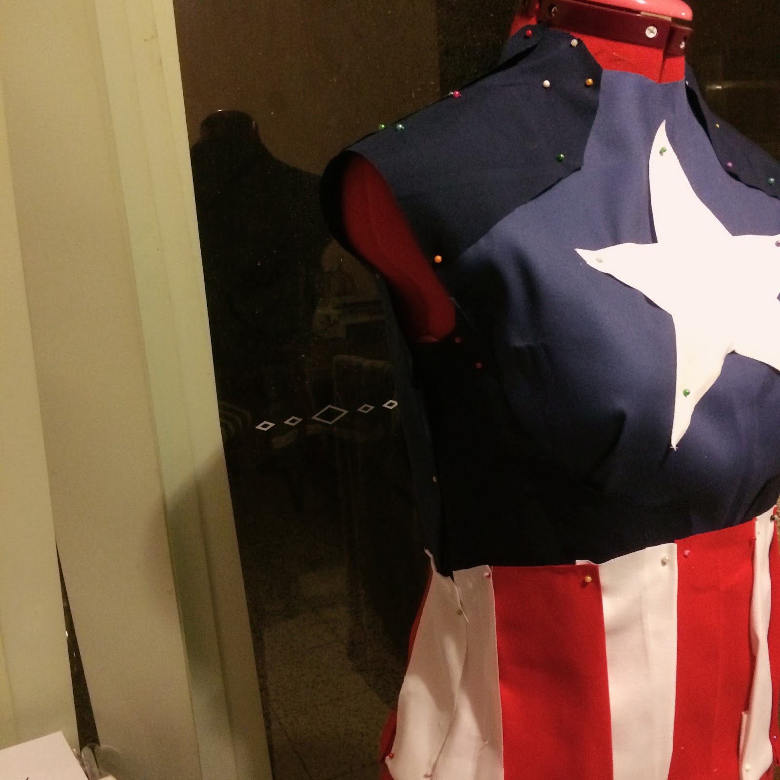 I copied a long sleeve shirt pattern onto some drafting paper and then added in all the patches and designs and bits and bobs. In the end, there was a ridiculous amount of pieces in the top half of the shirt. It wasn’t necessary – I could have just made them patches and sewn them onto one single main piece. But it’s a bit late for that now, innit? Anyway, the pieces that are sewn into the sleeves and bodice, rather than attached as patches, have a raised look that gives the illusion that I am actually muscular. And I wouldn’t be Captain America without those.