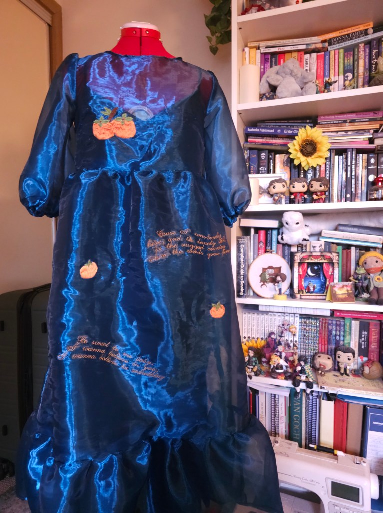 Hand embroidered tangerines and machine embroidered text, with lyrics by Japanese Breakfast, on a handmade blue iridescent organza dress