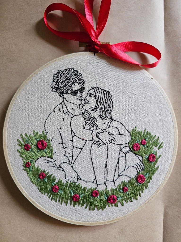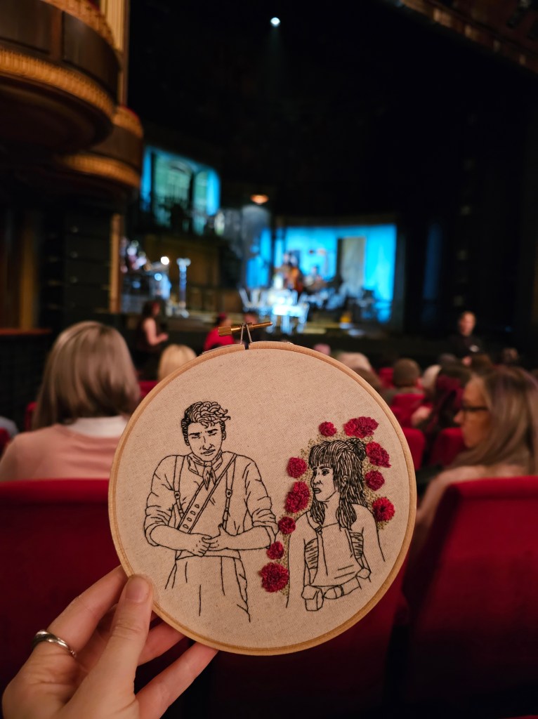 Embroidery with red carnations, green French knots, and blackwork inspired by the 2025 Australian cast of Hadestown